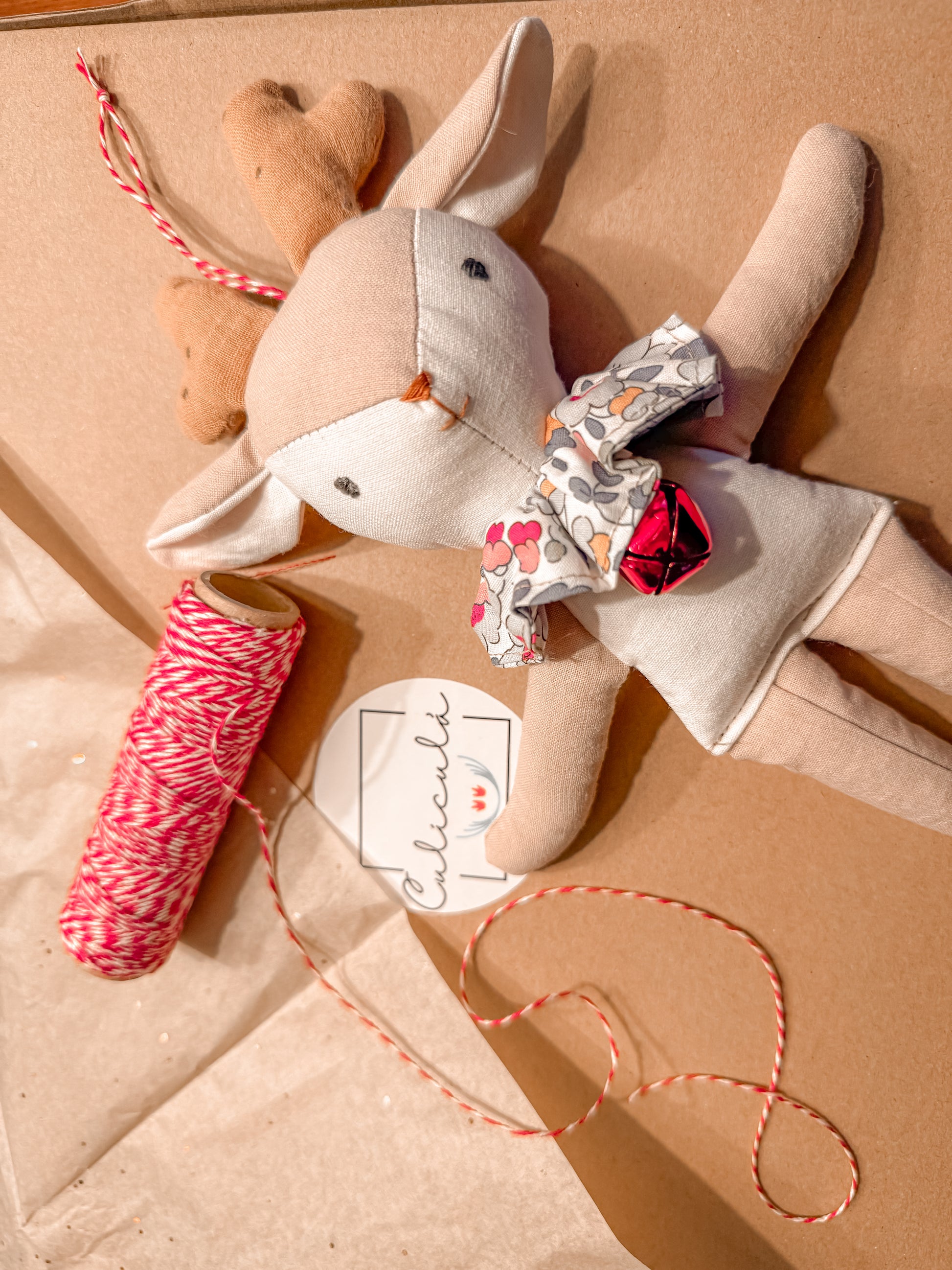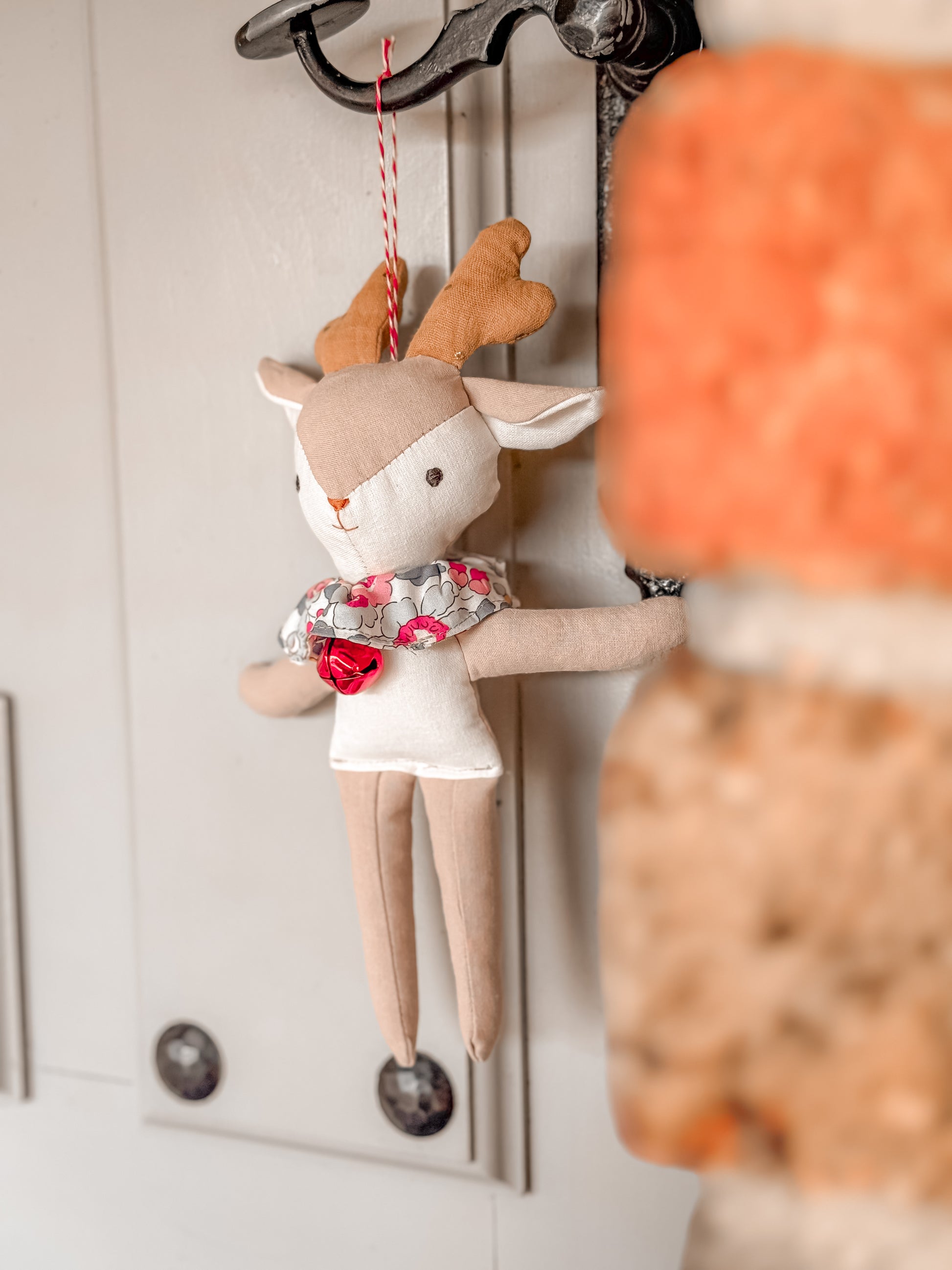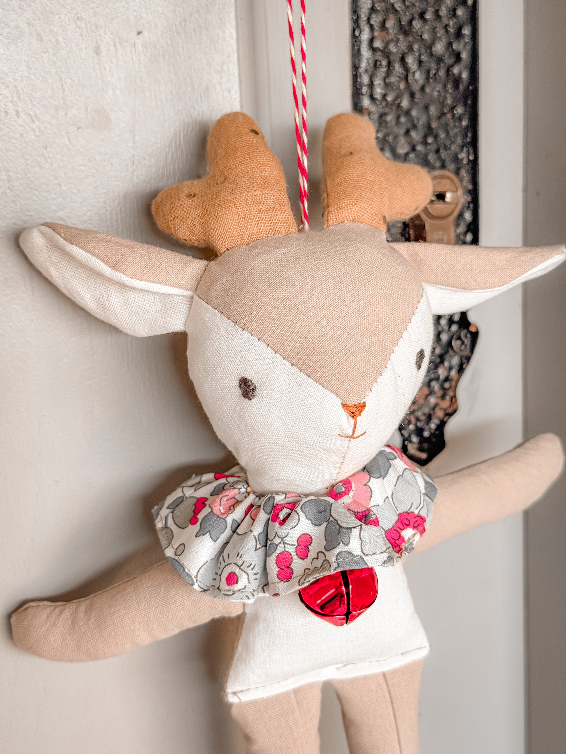 Nuestro muñequín más navideño. Vestido con un bonito cuello en flores liberty, y un lazo con cascabel.