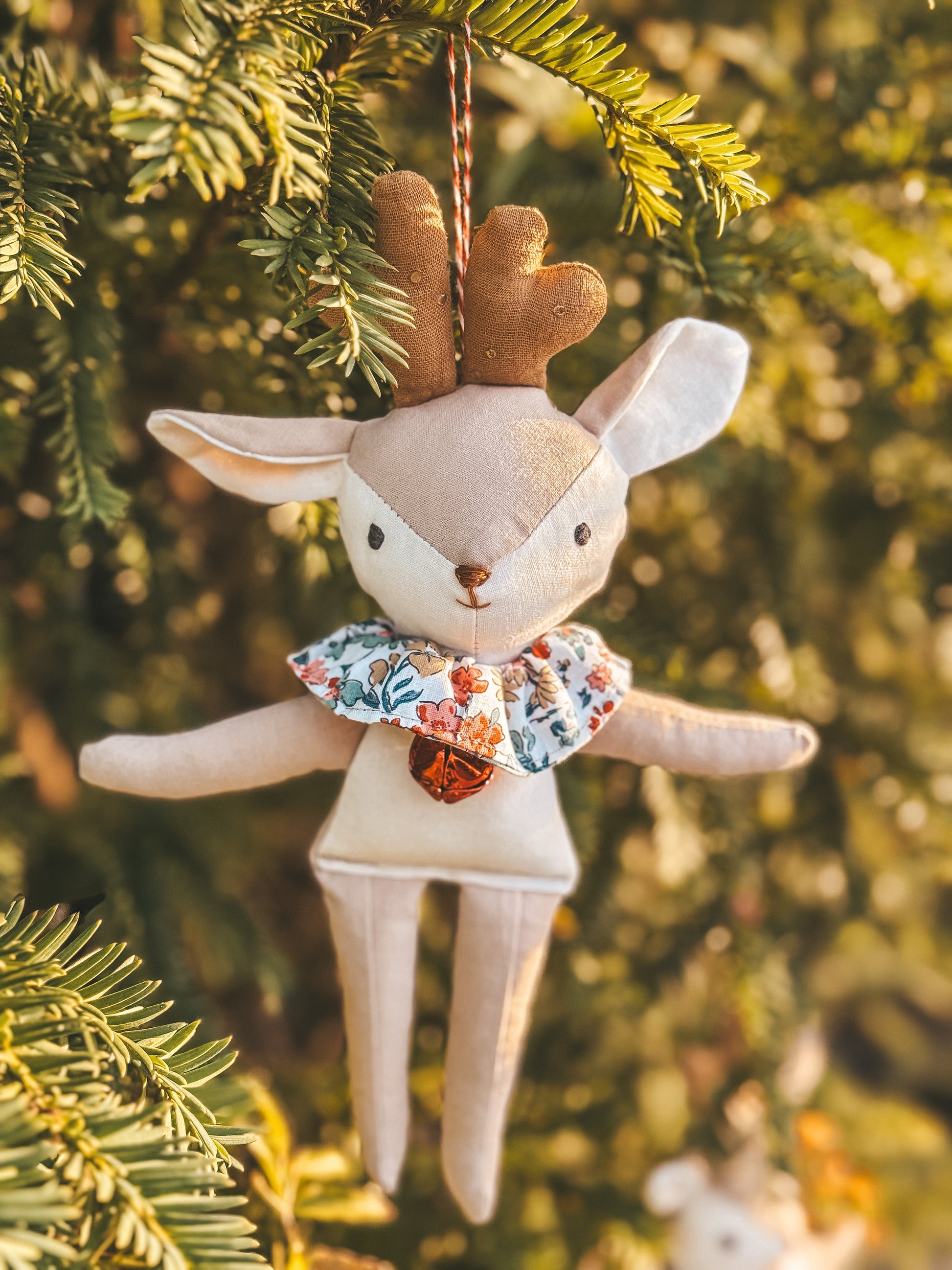 Nuestro muñequín más navideño. Vestido con un bonito cuello en flores liberty, y un lazo con cascabel.